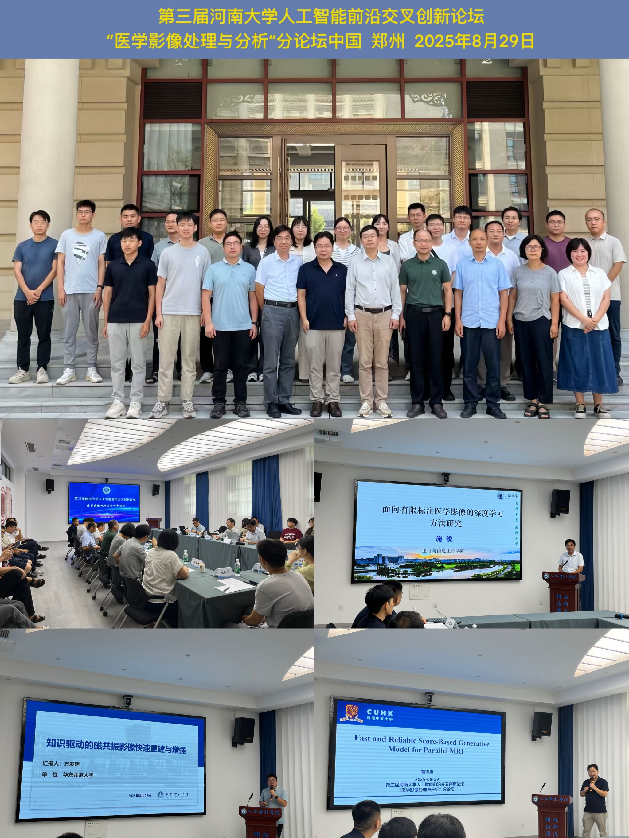8月29日,由BWIN必赢官方主办的第三届必赢bwin官方网站人工智能前沿交叉创新论坛“医学影像处理与分析”分论坛在郑州校区九章学堂南楼C座417会议室成功举办。论坛汇聚了来自华东师范大学、上海大学、香港中文大学等多所高水平高校的知名专家学者,围绕医学影像的深度学习、快速重建与智能增强等前沿议题展开深入研讨,共同探索人工智能技术在医学影像精准诊断与分析中的创新应用与未来发展。论坛由学院副经理周毅主持,部分教师及员工代表参加。